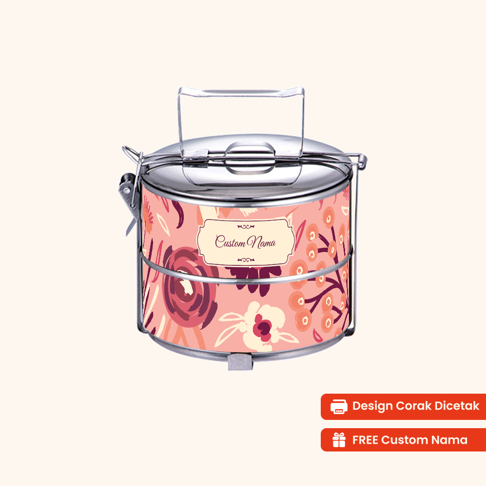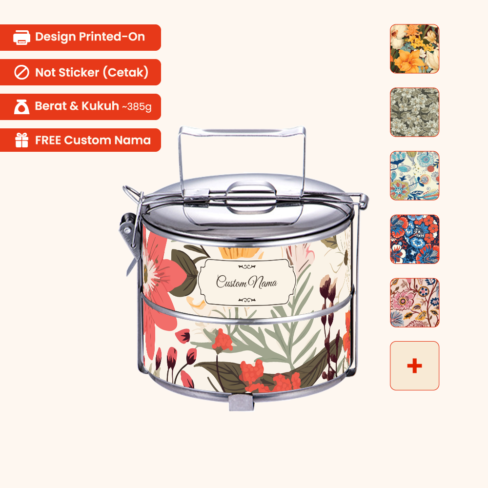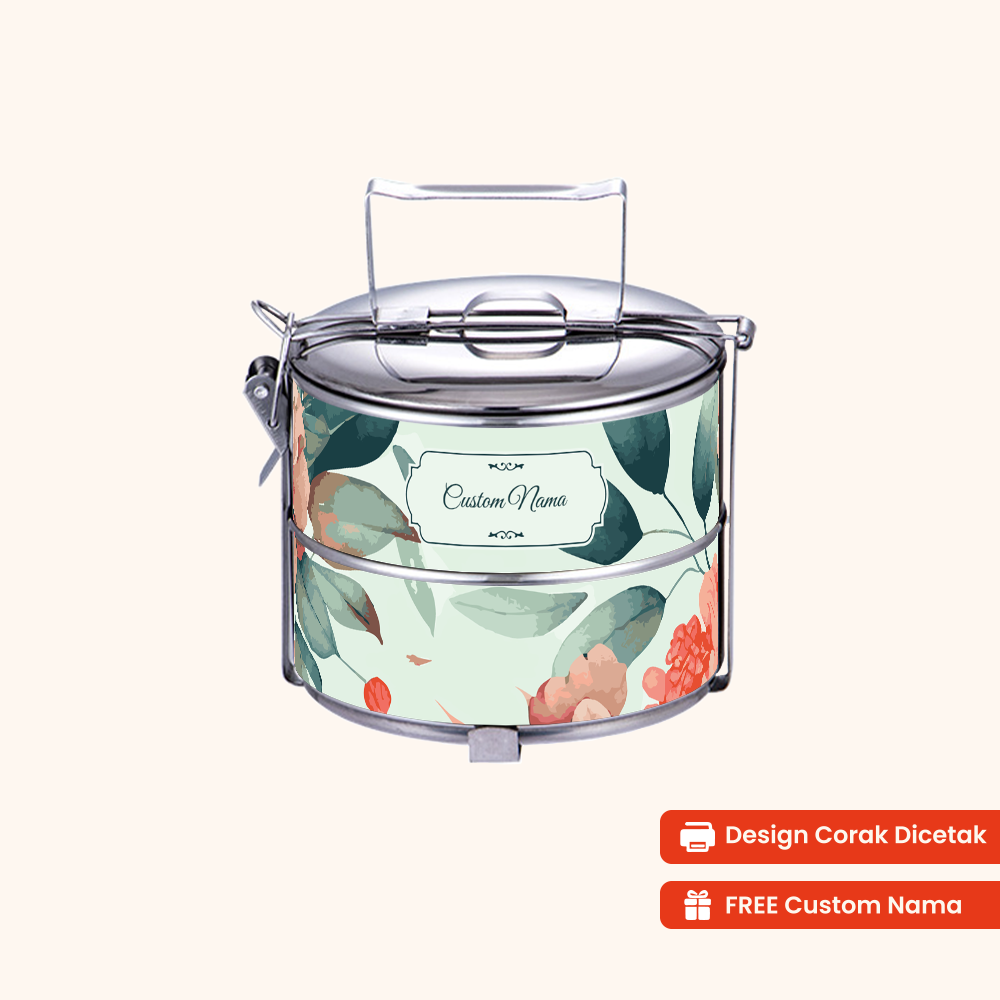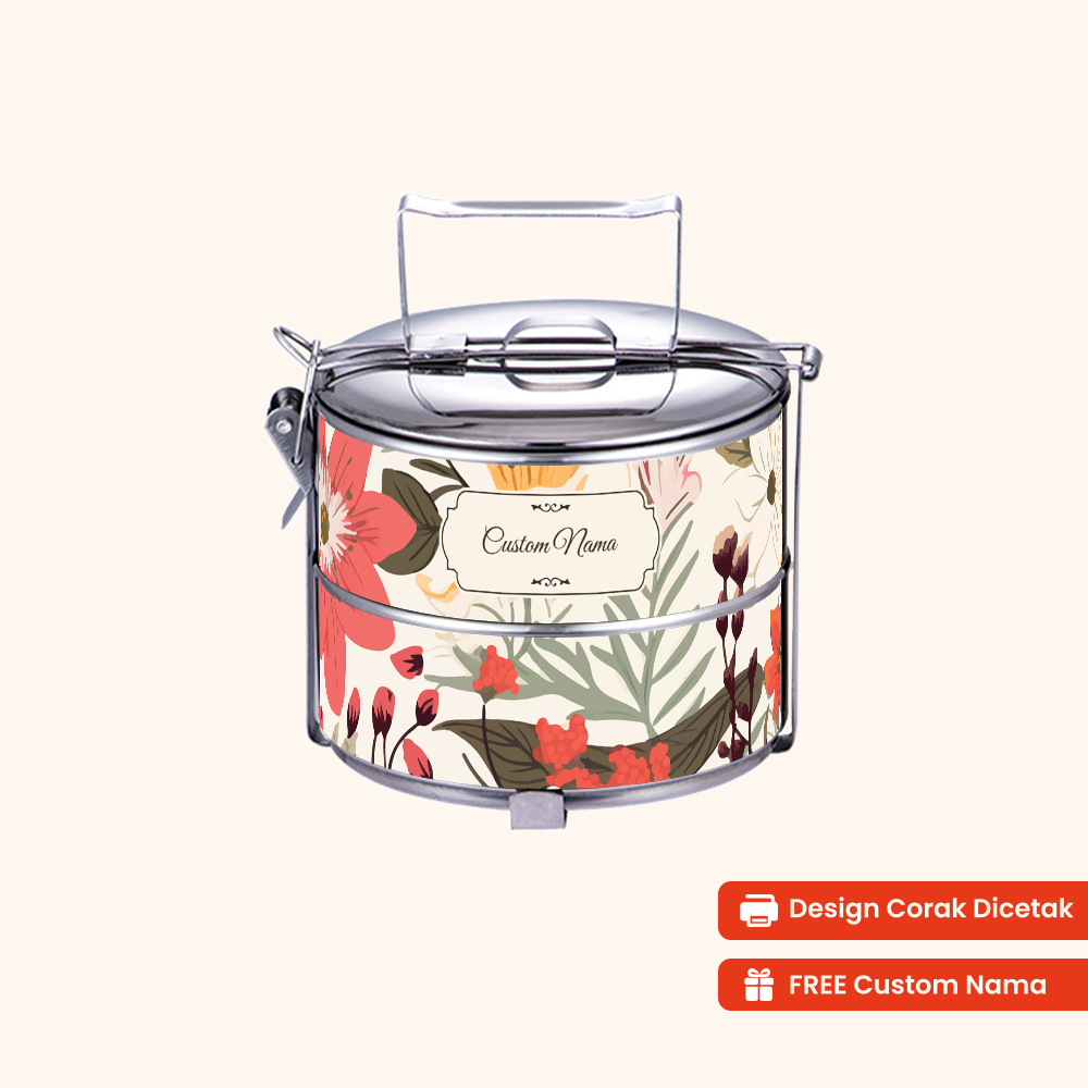 Corak Dicetak Terus (Not Sticker) 12cm 2-Tier Floral 03 Tiffin Carrier + FREE Custom Nama for Mangkuk Tingkat