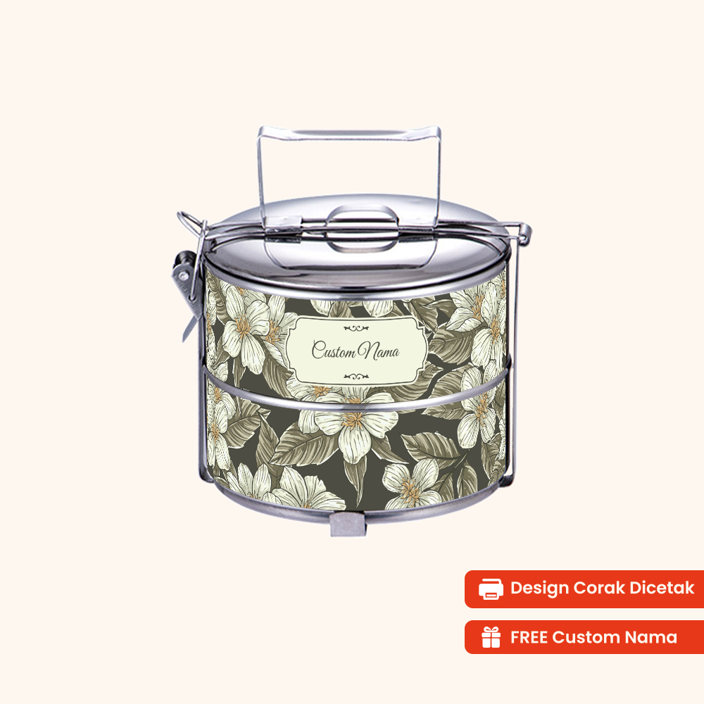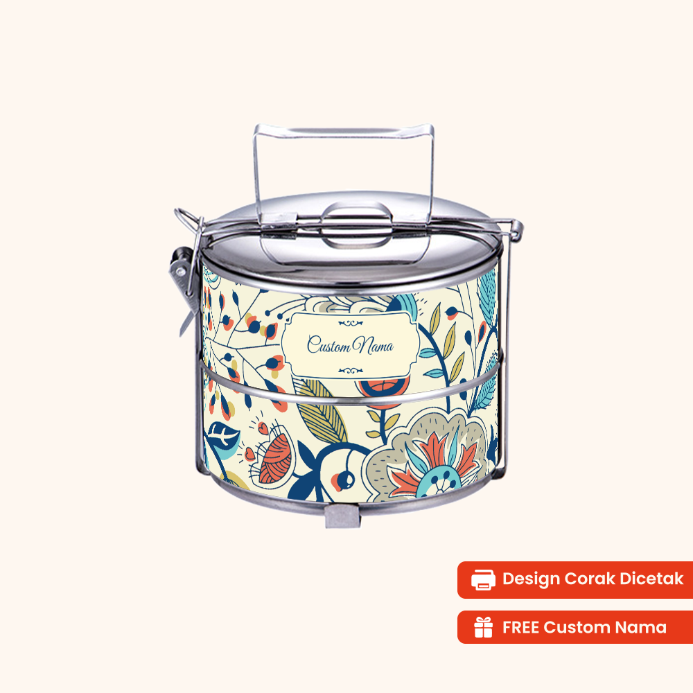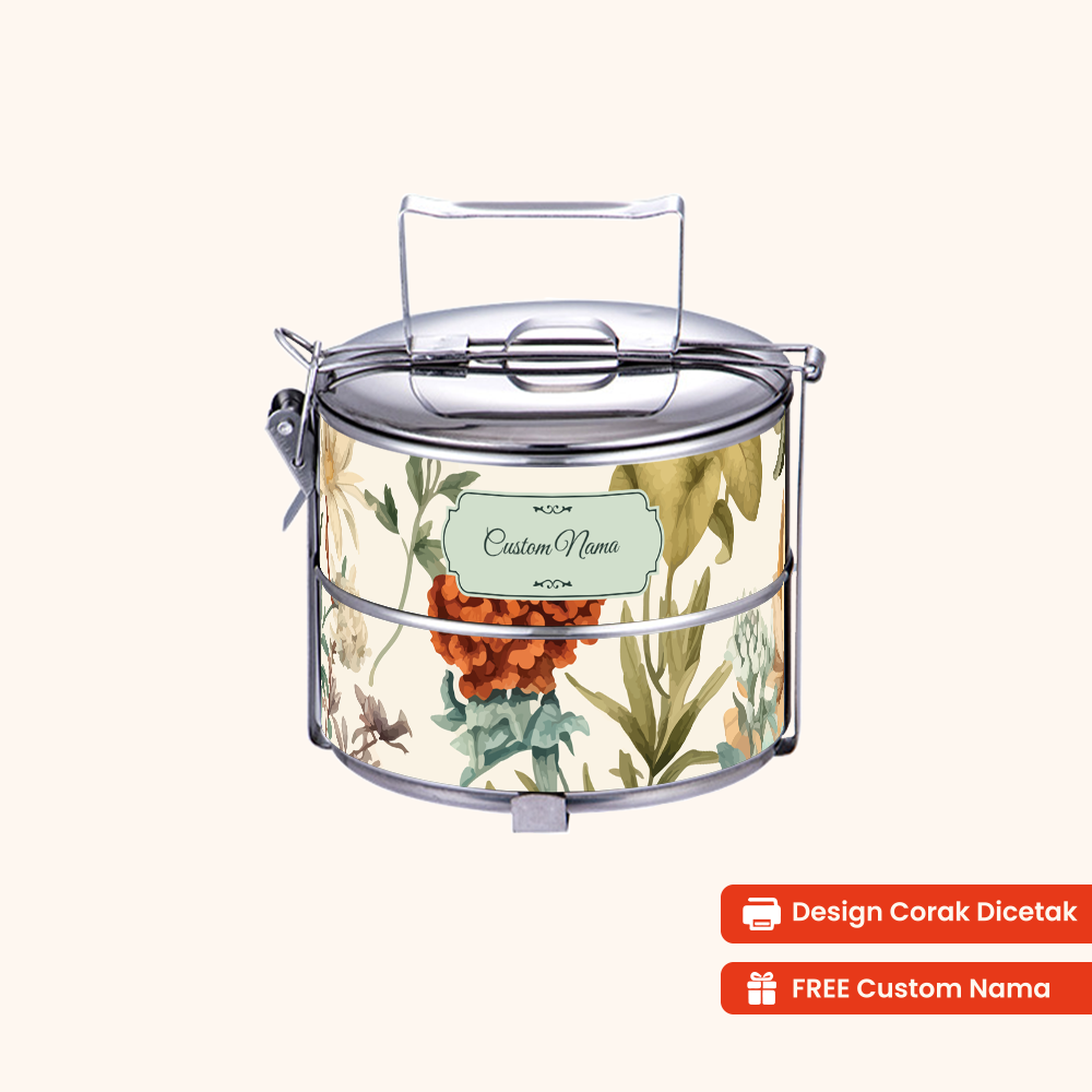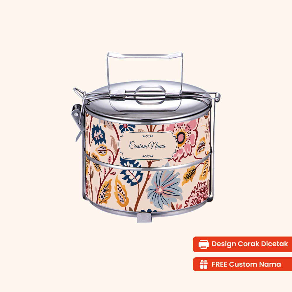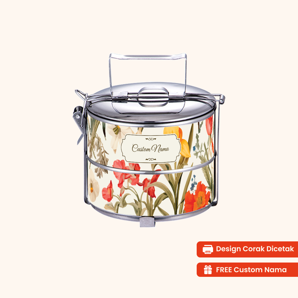 Corak Dicetak Terus (Not Sticker) 12cm 2-Tier Floral 03 Tiffin Carrier + FREE Custom Nama for Mangkuk Tingkat