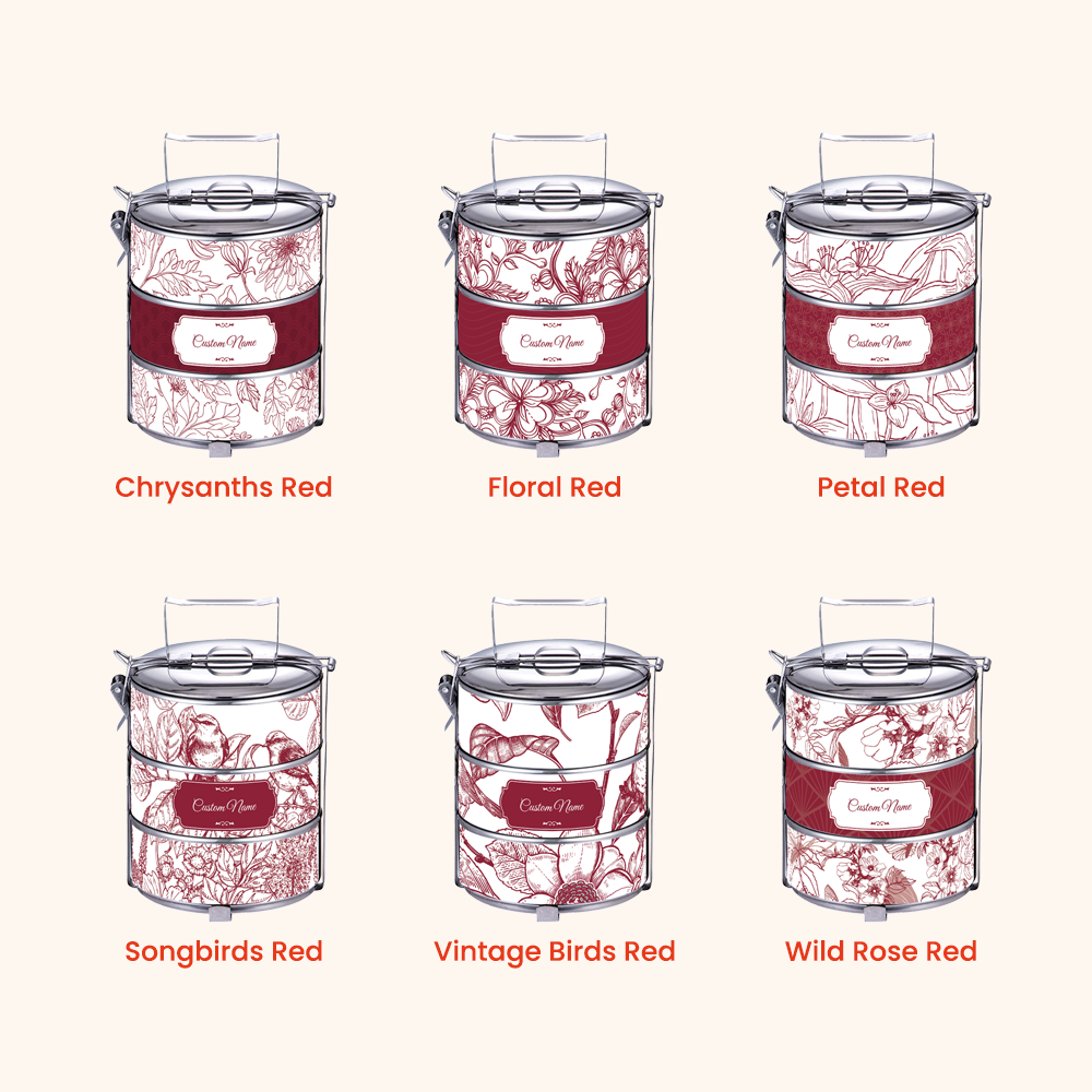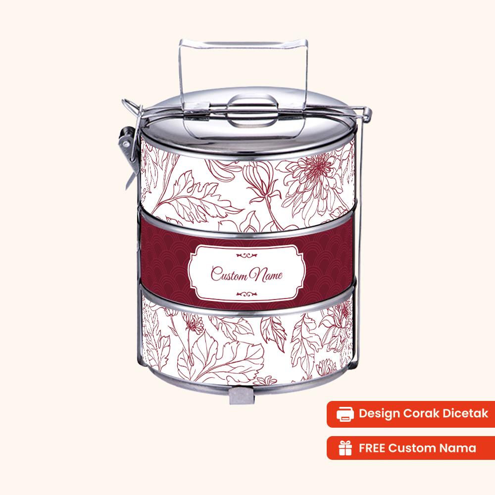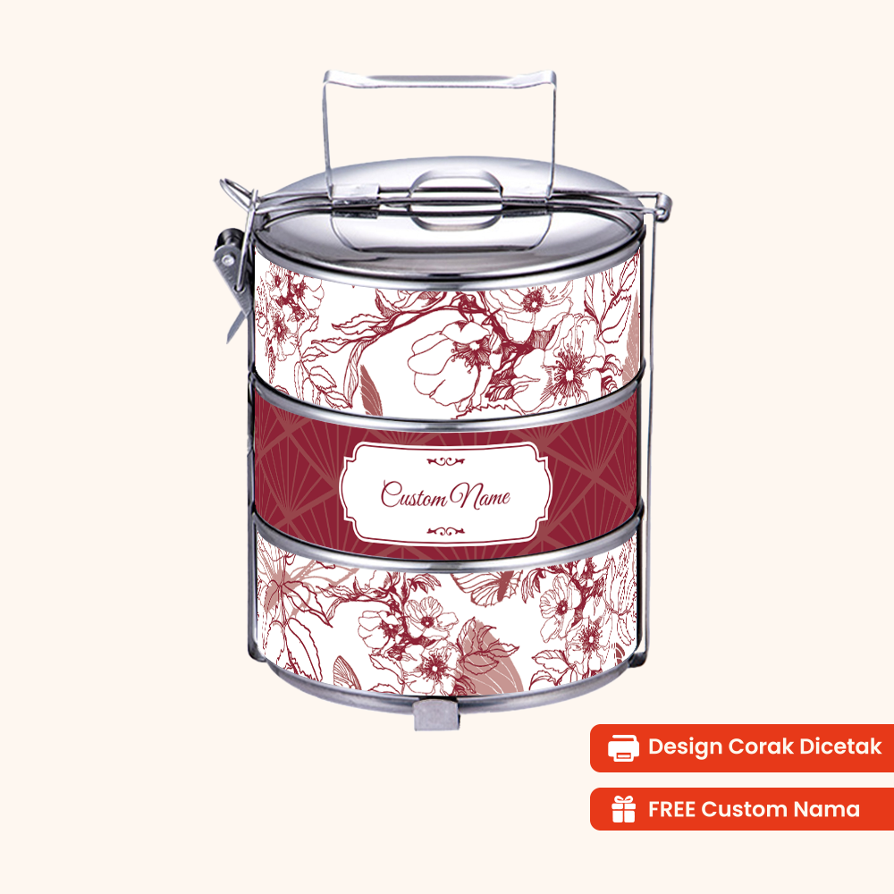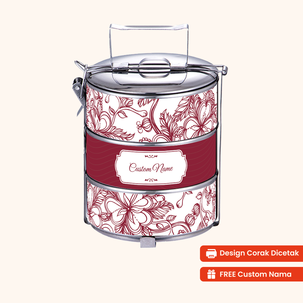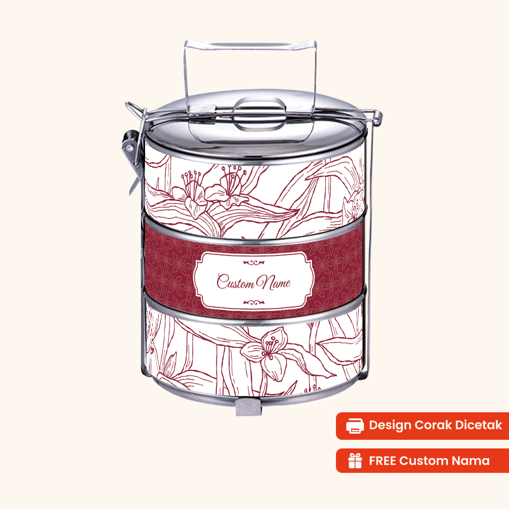 Corak Dicetak Terus (Not Sticker) 12cm 3-Tier Artline Red 01 Tiffin Carrier + FREE Custom Nama for Mangkuk Tingkat