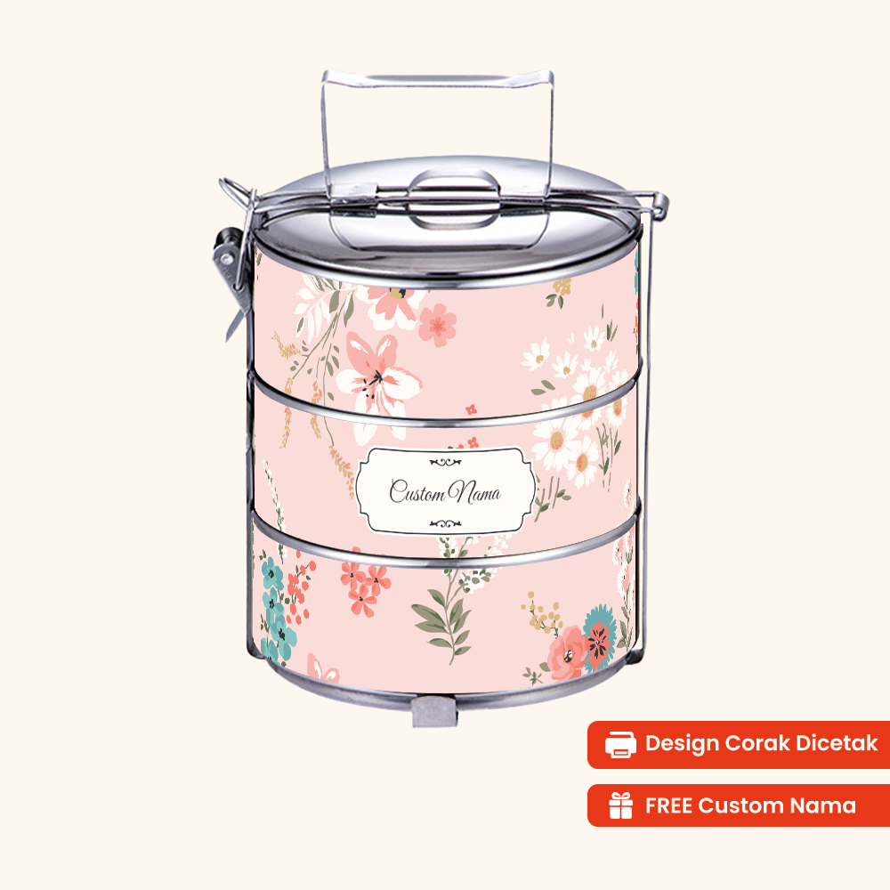 Corak Dicetak Terus (Not Sticker) — 12cm 3-Tier Floral 01 Tiffin Carrier + FREE Custom Nama for Mangkuk Tingkat