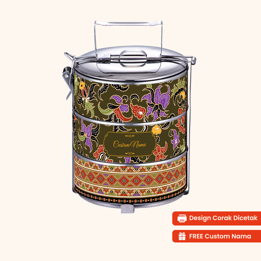 Corak Dicetak Terus (Not Sticker) — 12cm 3-Tier Batik 01 Tiffin Carrier + FREE Custom Nama for Mangkuk Tingkat