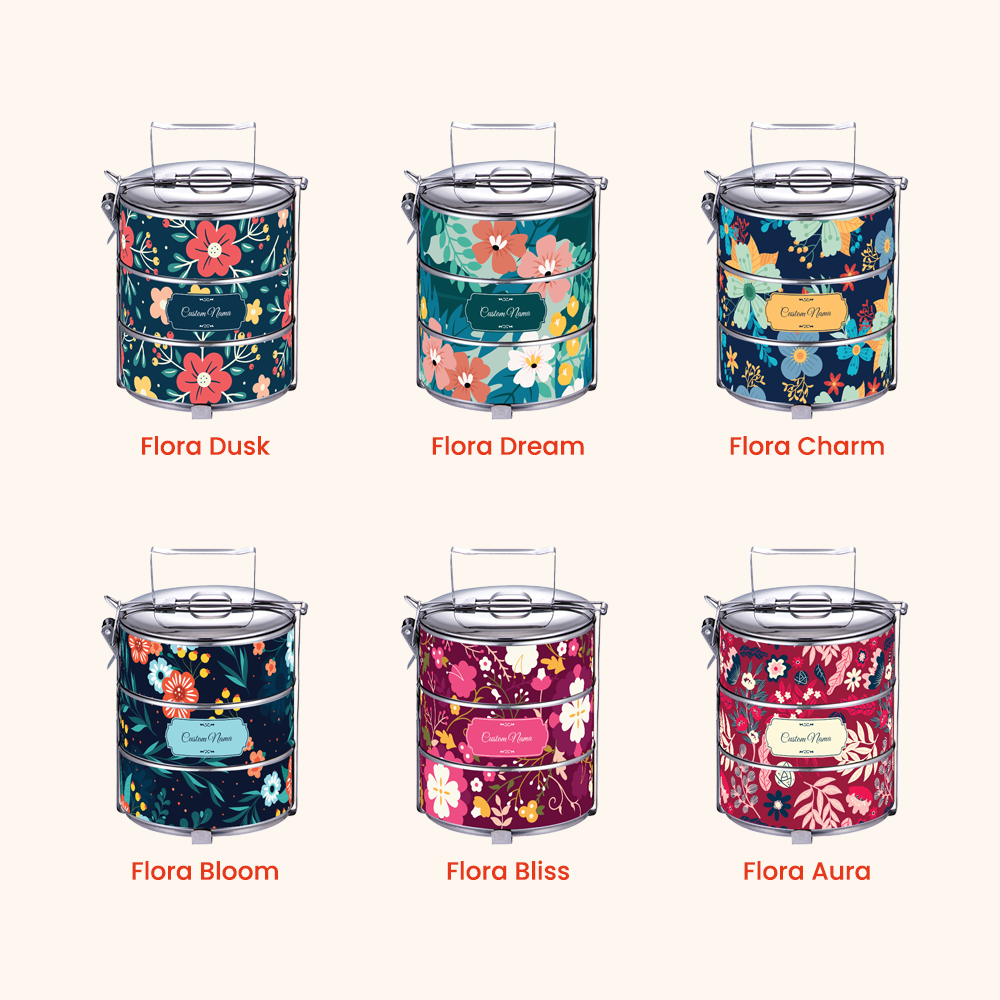 Corak Dicetak Terus (Not Sticker) — 12cm 3-Tier Floral 02 Tiffin Carrier + FREE Custom Nama for Mangkuk Tingkat