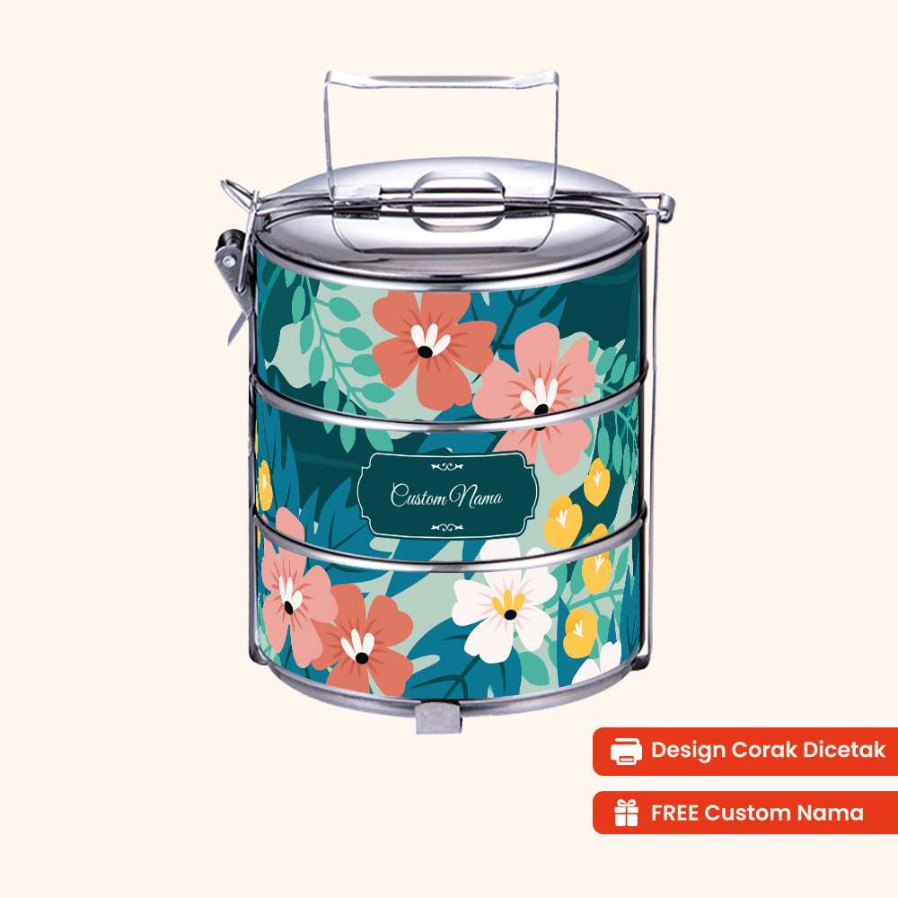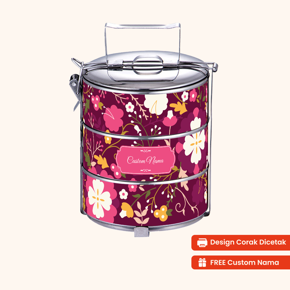 Corak Dicetak Terus (Not Sticker) — 14cm 3-Tier Floral 02 Tiffin Carrier + FREE Custom Nama